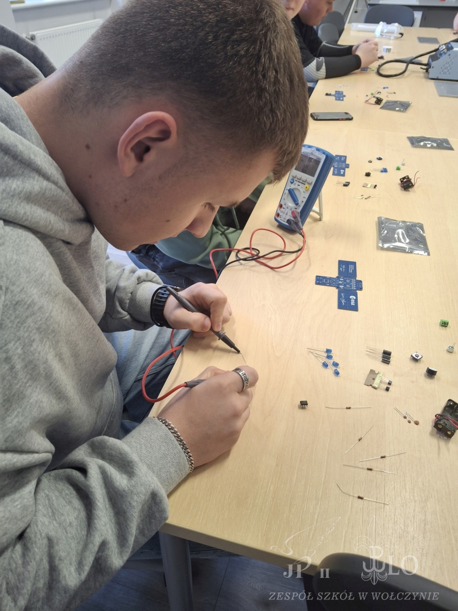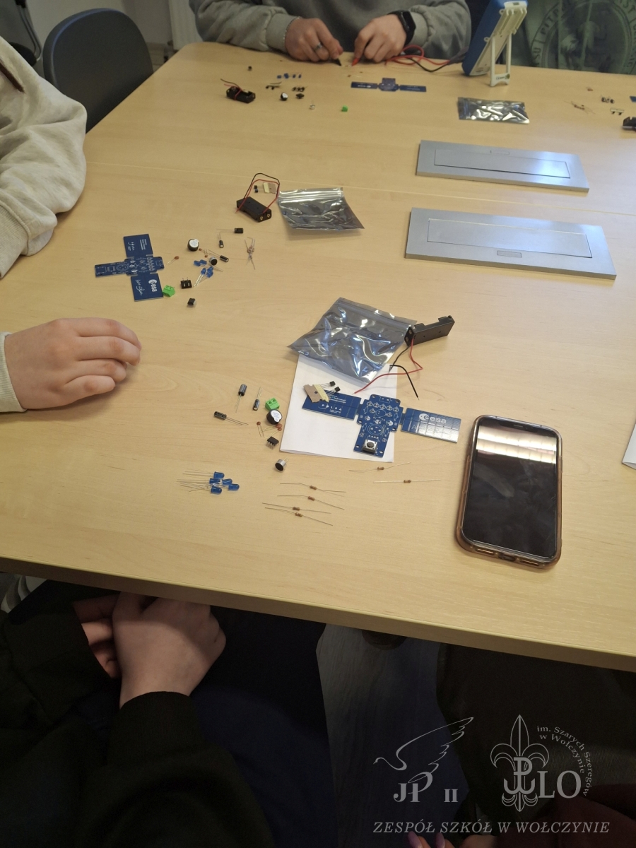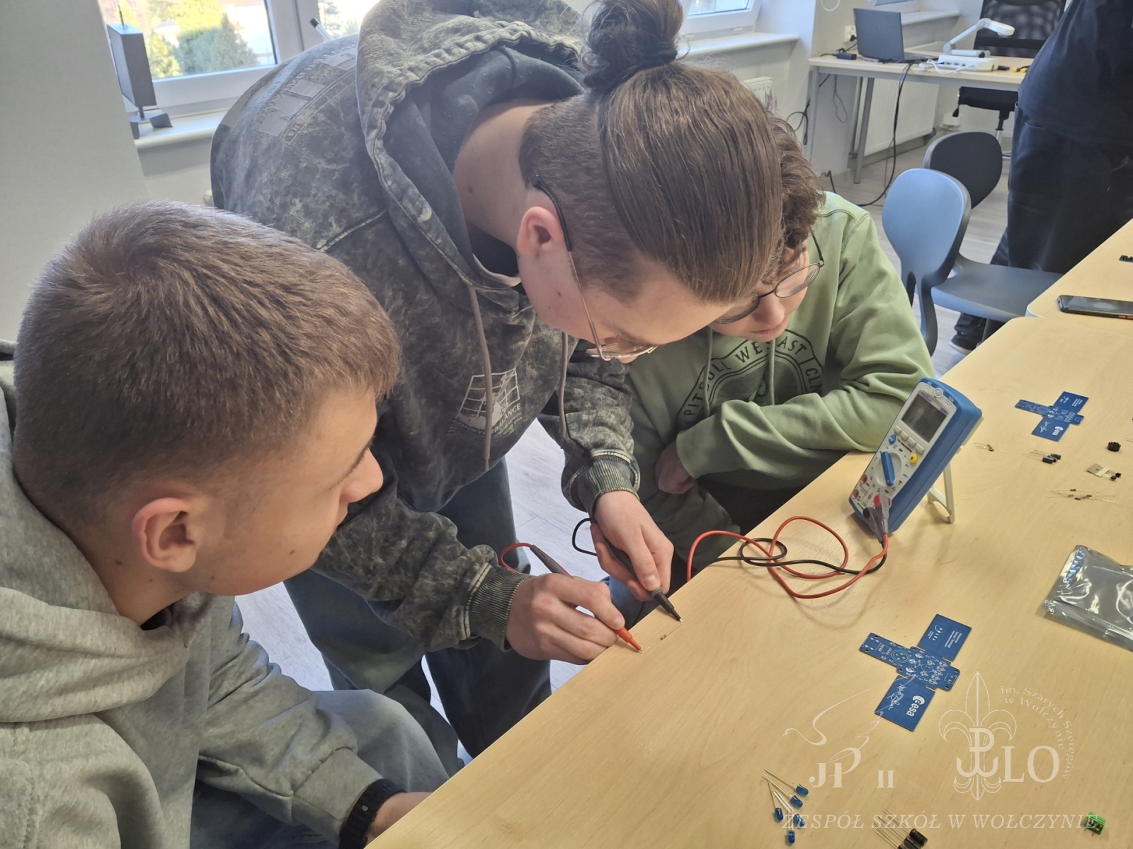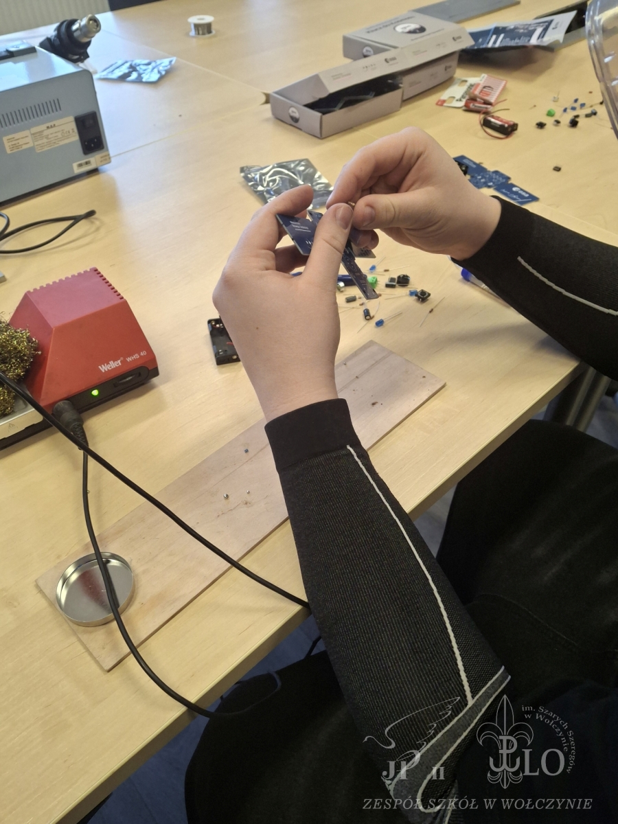 W części praktycznej, którą poprowadził Pan Marcin Kopaniecki mogliśmy złożyć swój własny klucz, ucząc się które elementy w jaki sposób należy montować na obwodzie drukowanym i kiedy ma to znaczenie (diody LED). Przy okazji uczniowie nabyli umiejętności posługiwania się lutownicą – wykorzystaliśmy w tym celu stację lutowniczą zakupioną w ramach projektu Laboratoria Przyszłości. Ten rodzaj umiejętności przyda się na pewno nie tylko w przypadku dalszych projektów związanych z elektroniką, ale również znajduje użycie w życiu codziennym.