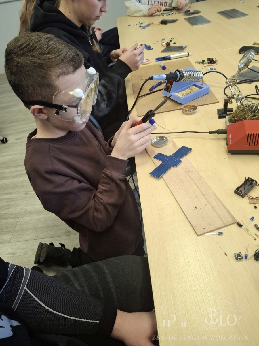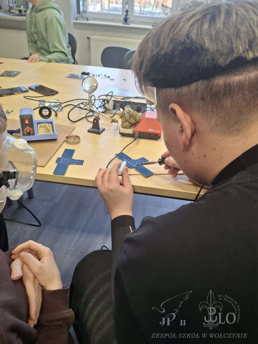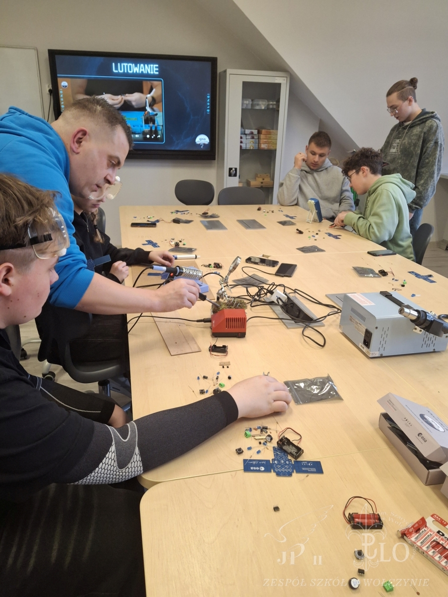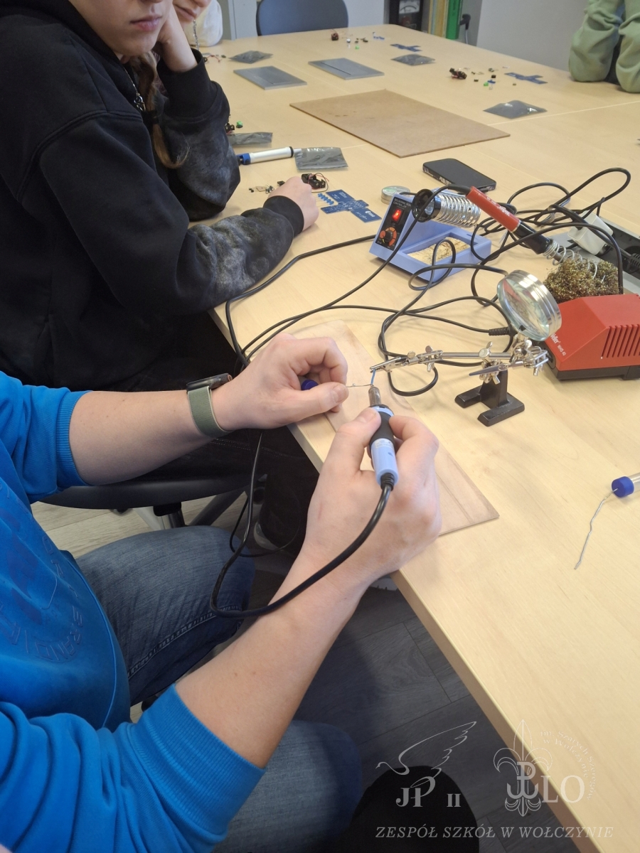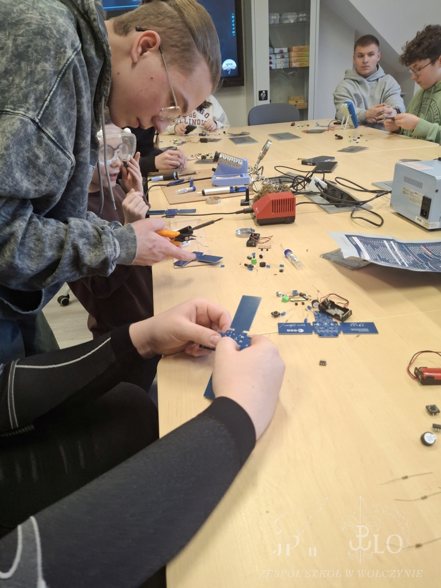W części praktycznej, którą poprowadził Pan Marcin Kopaniecki mogliśmy złożyć swój własny klucz, ucząc się które elementy w jaki sposób należy montować na obwodzie drukowanym i kiedy ma to znaczenie (diody LED). Przy okazji uczniowie nabyli umiejętności posługiwania się lutownicą – wykorzystaliśmy w tym celu stację lutowniczą zakupioną w ramach projektu Laboratoria Przyszłości. Ten rodzaj umiejętności przyda się na pewno nie tylko w przypadku dalszych projektów związanych z elektroniką, ale również znajduje użycie w życiu codziennym.