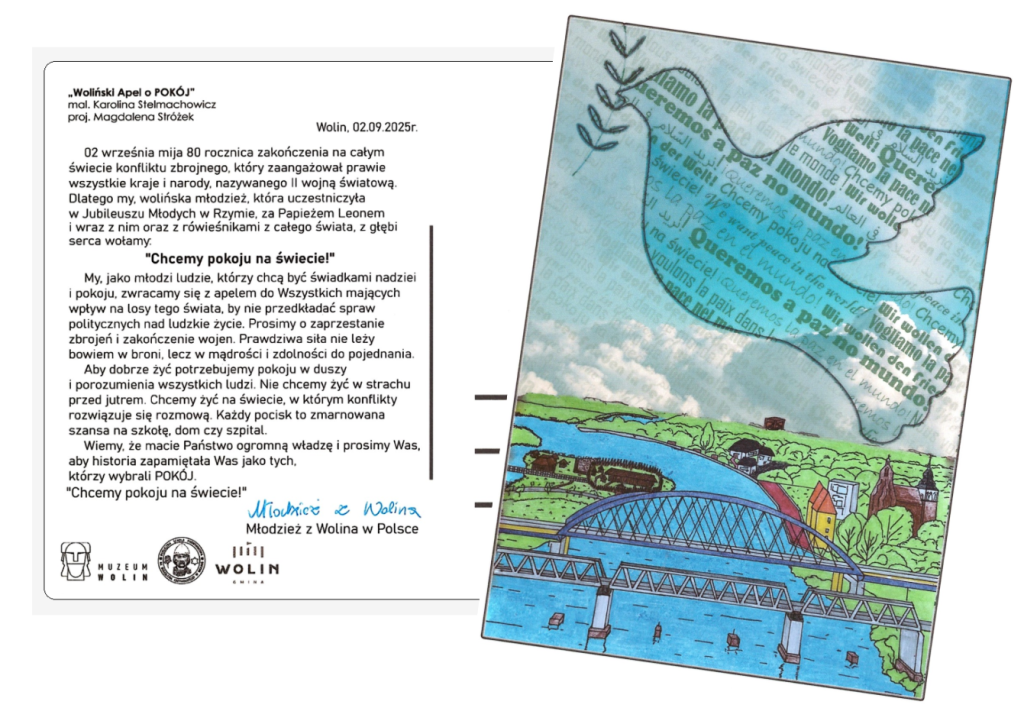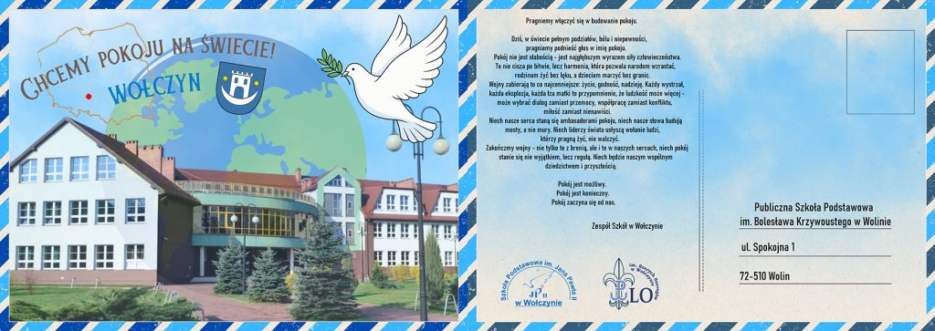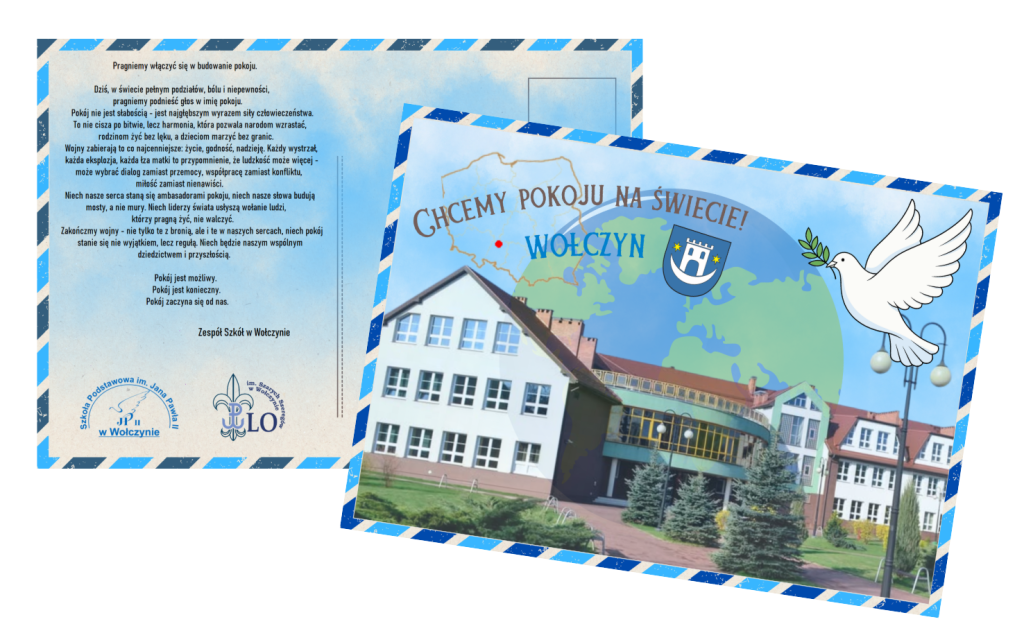 Podczas Jubileuszu Młodych w Rzymie, Ojciec Święty Leon XIV zachęcał młodych, aby modlić się o pokój na świecie. Młodzież z Wolina, która uczestniczyła w tym spotkaniu przygotowała apel o pokój, z którym zwraca się do wszystkich ludzi. Został on wydany w formie kartki pocztowej i rozesłany m.in. do szkół. My również ten apel otrzymaliśmy i pragniemy włączyć się w budowanie pokoju na świecie. Łącząc się z Młodzieżą z Wolina przesyłamy widokówkę z Zespołu Szkół w Wołczynie, ponieważ również uważamy, że POKÓJ jest wartością najważniejszą!