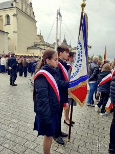 O godzinie 11 została odprawiona Msza Święta z udziałem pocztów sztandarowych pod przewodnictwem duszpasterza Rodziny Szkół im. Jana Pawła II Księdza Biskupa Marka Solarczyka. Bezpośrednio po Mszy Świętej nastąpiło: